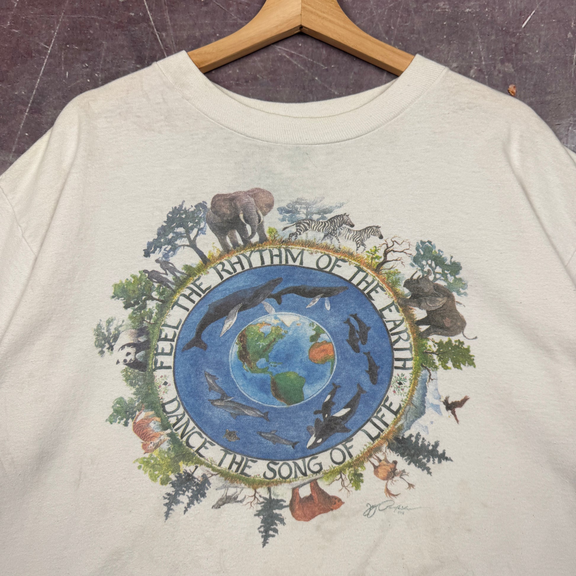 90s White Feel The Rhythm Of The Earth Animal Graphic Shirt XL 2525