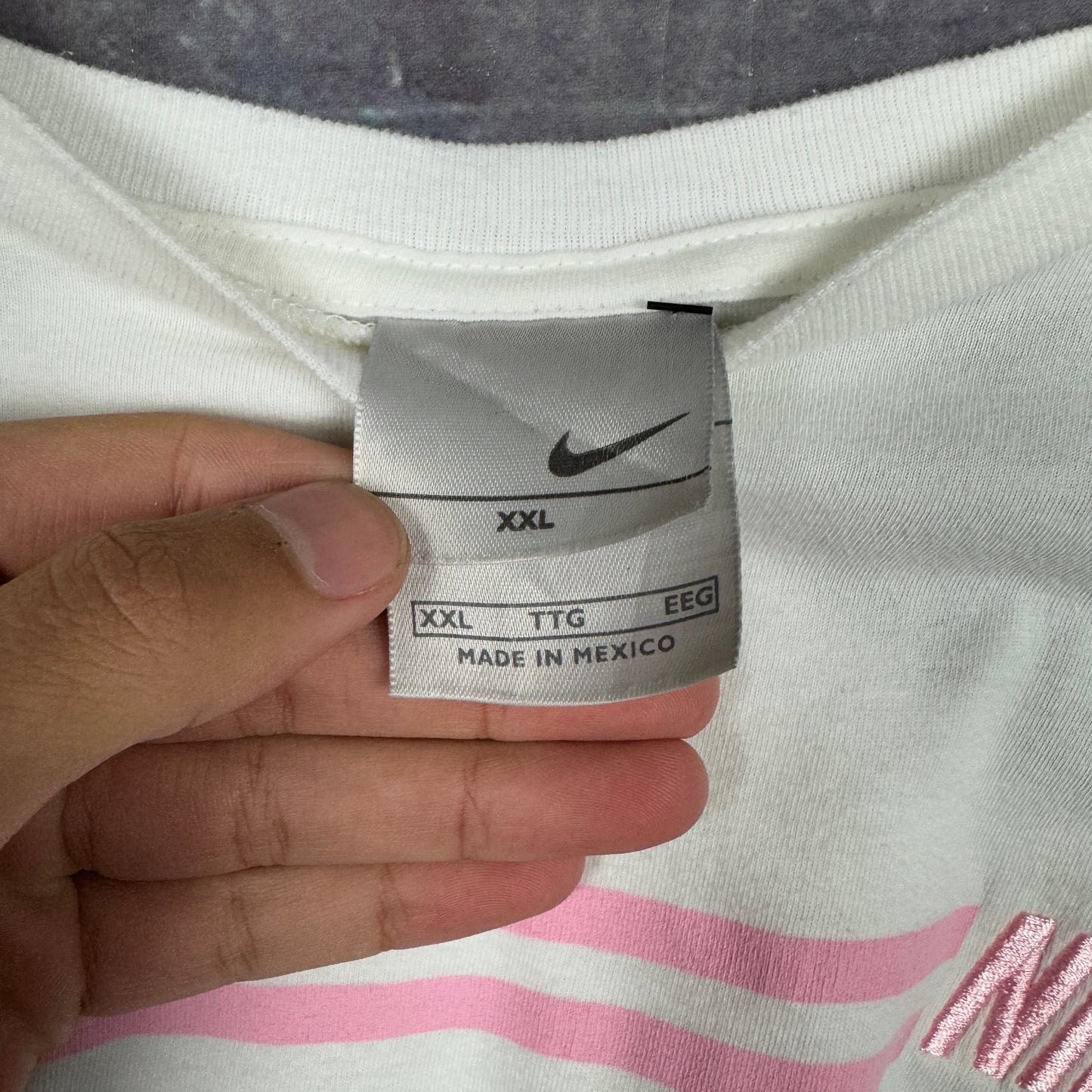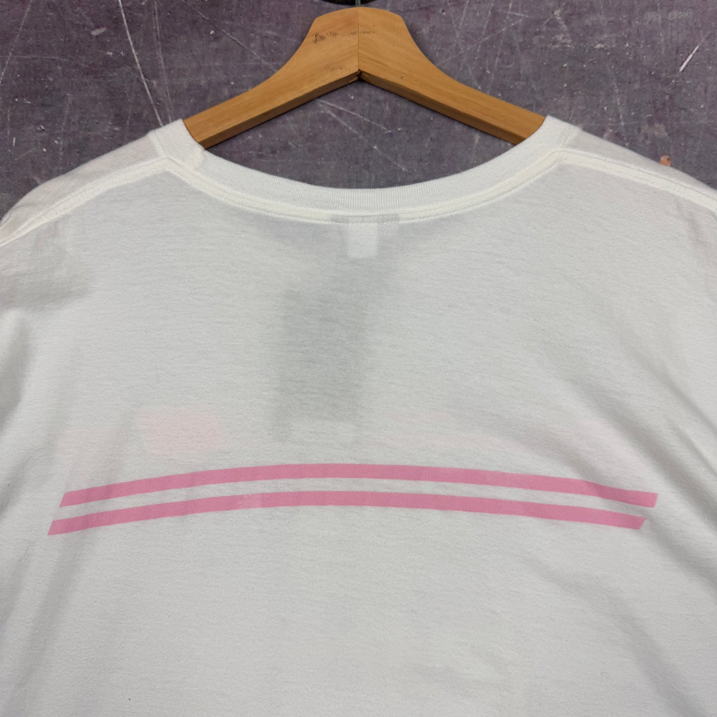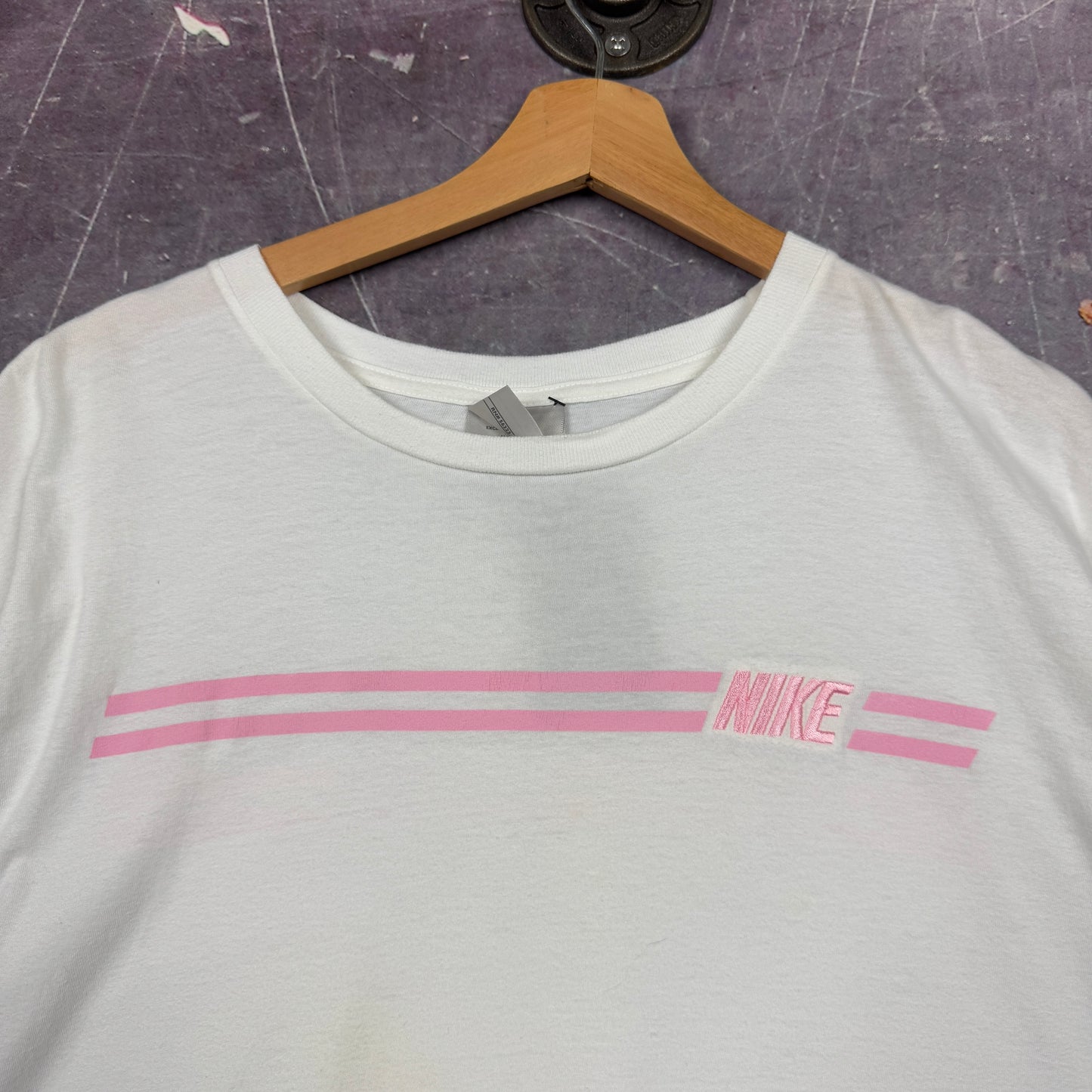 Early 00s White Pink Striped Nike Essential Spellout Logo Graphic Shirt XXL 1012
